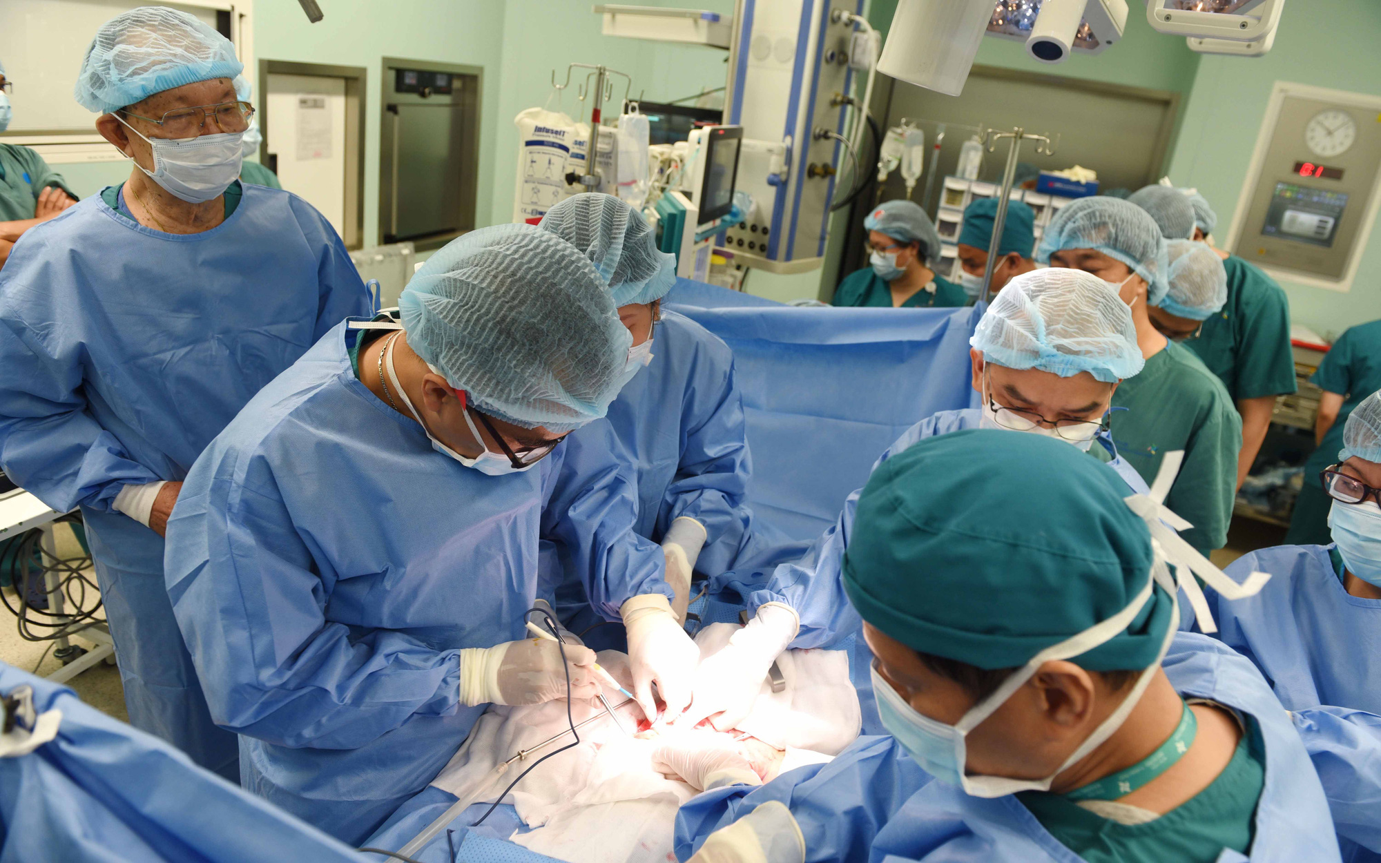 GS Trần Đông A (bìa trái) quan sát các đồng nghiệp đang mổ tách rời 2 bé Trúc Nhi - Diệu Nhi - Ảnh: DUYÊN PHAN
