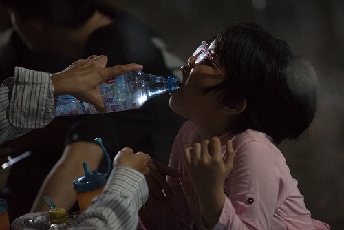 Trước khi vào lớp học bé Quỳnh cũng phải uống thuốc đầy đủ theo chỉ định bác sĩ.