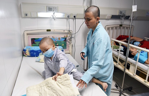 Vứt bỏ hết mặc cảm, người mẹ Nguyễn Thị Thanh Vân đã cạo đầu để cùng con chiến đấu với căn bệnh ung thư trong bệnh viện Truyền máu Huyết học TP.HCM.